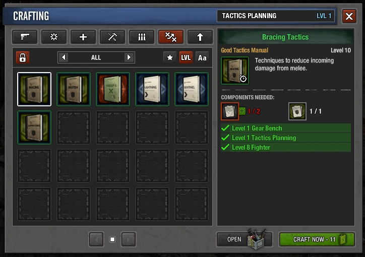 The Tactics Planning skill is required to craft higher-level manuals. The Tactics Planning skill for the compound is shown in the Tactics Manual crafting window. Crafting manuals will add to the skill, and once sufficient experience is gained, the player will level up their Tactics Planning skill.