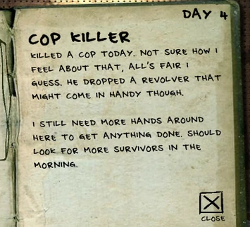 Killed a cop today. Not sure how I feel about that, all’s fair I guess. He dropped a revolver that might come in handy though.