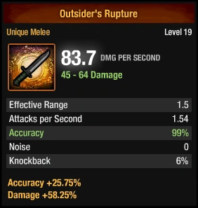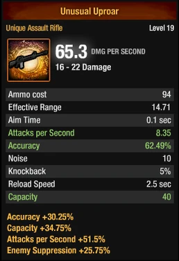 Unique items can be scavenged during missions[n 1] in the Dead Zone. Additionally, earning 300 points in the Raid on Union Island guarantees one as part of the Raid Haul and Unusual Improvised Boxes may have a Unique Improvised inside as well. The background color for Unique equipment is an orange-colored bounding box with an orange-colored galaxy design behind the weapon. It also features orange lettering over a brown banner in the name display.
